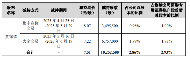 黄锦禧合计减持1025.25万股,减持均价7.51元/股,合计套现7699.63万元。