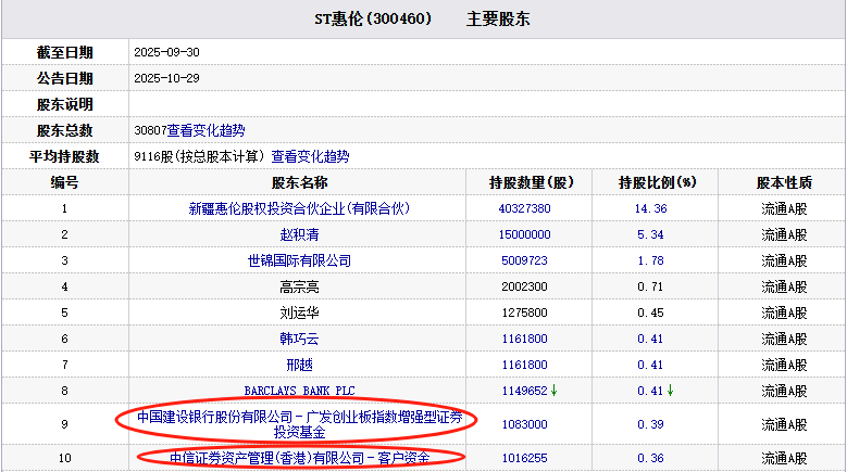 截至2025年9月30日,ST惠伦的第九大股东为中国建设银行股份有限公司-广发创业板指数增强型证券投资基金,持股数量为1083000股,持股比例为0.39%;第十大股东为中信证券资产管理(香港)有限公司-客户资金,持股数量为1016255股,持股比例为0.36%。