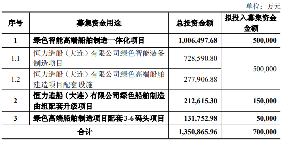 公司本次向特定对象发行A股股票募集资金总额不超过700,000.00万元(含本数),扣除发行费用后的净额拟投资以下项目:绿色智能高端船舶制造一体化项目、恒力造船(大连)有限公司绿色船舶制造曲组配套升级项目和绿色高端船舶制造项目配套3-6码头项目。
