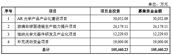 蓝特光学募集资金总额为6.30亿元,扣除发行费用后,募集资金净额为5.55亿元。蓝特光学最终募集资金净额较原计划少1.52亿元。蓝特光学2020年9月16日发布的招股说明书显示,公司计划募集资金7.07亿元,分别用于高精度玻璃晶圆产业基地建设项目、微棱镜产业基地建设项目、补充流动资金。