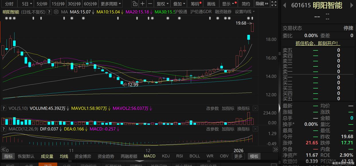二级市场上,1月12日,明阳智能涨停收盘,收于涨停价19.68元/股,总市值445.1亿元。将时间线拉长来看,1月6日—12日这5个交易日,明阳智能区间累计涨幅达33.6%,同期大盘涨幅为3.53%。