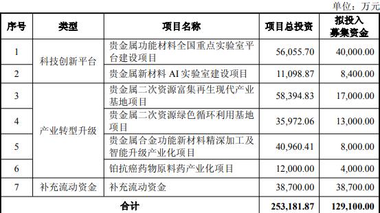 本次向特定对象发行A股股票募集资金总额不超过129,100.00万元(含本数),扣除发行费用后,募集资金拟投资于贵金属功能材料全国重点实验室平台建设项目、贵金属新材料AI实验室建设项目、贵金属二次资源富集再生现代产业基地项目、贵金属二次资源绿色循环利用基地项目、贵金属合金功能新材料精深加工及智能升级产业化项目、铂抗癌药物原料药产业化项目、补充流动资金。