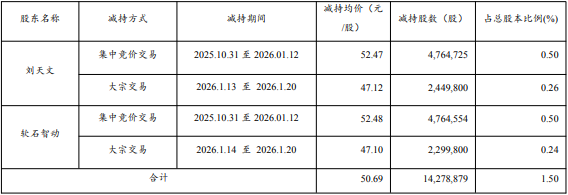 2025年10月31日至2026年1月12日,刘天文通过集中竞价交易方式减持4,764,725股,减持均价为52.47元/股;2026年1月13日至2026年1月20日,刘天文通过大宗交易方式减持2,449,800股,减持均价为47.12元/股。