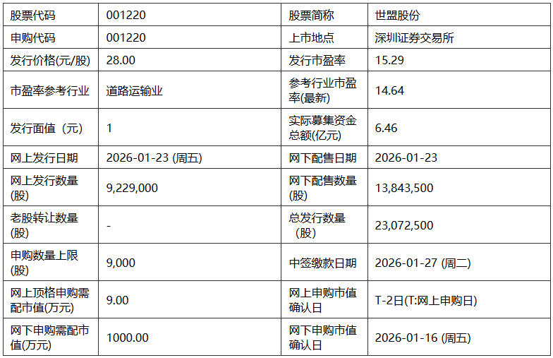 世盟股份2026年1月22日披露的上市发行公告显示,按本次发行价格28.00元/股和23,072,500股的新股发行数量计算,若本次发行成功,预计公司募集资金总额为64,603.00万元,扣除发行费用8,798.74万元(不含增值税)后,预计募集资金净额为55,804.26万元。