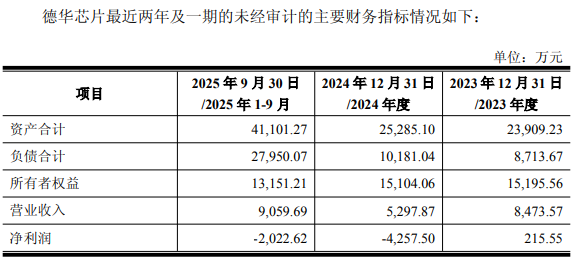 2023年度、2024年度、2025年前三季度,德华芯片营业收入分别为8,473.57万元、5,297.87万元、9,059.69万元,净利润分别为215.55万元、-4,257.50万元、-2,022.62万元。