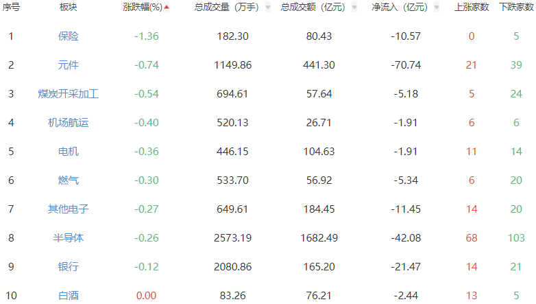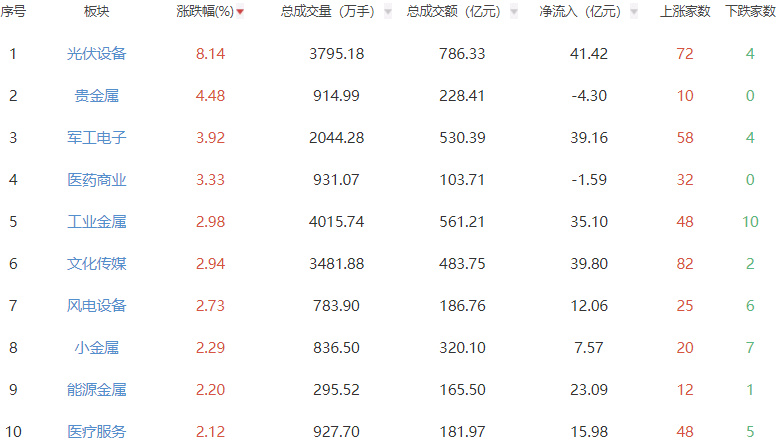 行业板块方面,光伏设备、贵金属、军工电子等板块涨幅居前,保险、元件、煤炭开采加工等板块跌幅居前。