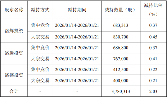 公司于2026年1月22日收到公司第一大股东常州市洛辉投资有限公司(以下简称“洛辉投资”)及其一致行动人常州市洛腾投资有限公司(以下简称“洛腾投资”)、常州市洛盛投资合伙企业(有限合伙)(以下简称“洛盛投资”)出具的《简式权益变动报告书》,洛辉投资、洛腾投资、洛盛投资于2026年1月14日至2026年1月21日期间通过大宗交易、集中竞价交易的方式合计减持公司股票3,780,313股,减持后合计持股比例降至45.00%,权益变动触及5%刻度。