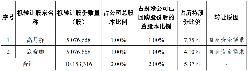 截至2026年1月22日,公司总股本为507,665,872股,其中公司回购专用证券账户持有550,000股。高月静拟转让股份的总数为5,076,658股,占公司总股本的比例为1.00%,占已剔除回购专用账户中股份数量的总股本比例为1.00%;寇晓康拟转让股份的总数为5,076,658股,占公司总股本的比例为1.00%,占已剔除回购专用账户中股份数量的总股本比例为1.00%。出让方合计拟转让股份的总数为10,153,316股,占公司总股本的比例为2.00%,占已剔除回购专用账户中股份数量的总股本比例为2.00%。