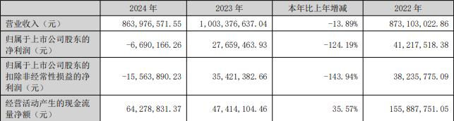 2024年,公司实现营业收入8.64亿元,同比减少13.89%;归属于上市公司股东的净利润-669.02万元;归属于上市公司股东的扣非净利润为-1556.39万元;经营活动产生的现金流量净额为6427.88万元。