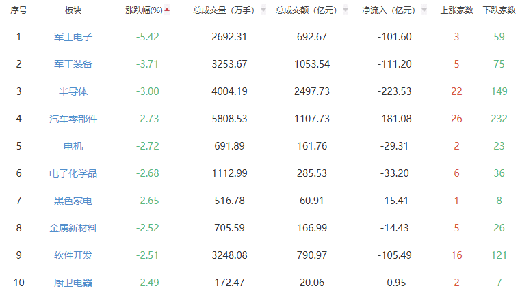 板块方面,贵金属、油气开采及服务、小金属等板块涨幅居前,军工电子、军工装备、半导体等板块跌幅居前。