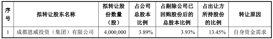 公告显示,恩威医药总股本为102,891,887股,其中公司回购专用证券账户持有1,055,326股。本次出让方拟转让股份总数为4,000,000股,占公司总股本的比例为3.89%,占剔除公司已回购股份后的总股本的比例为3.93%。