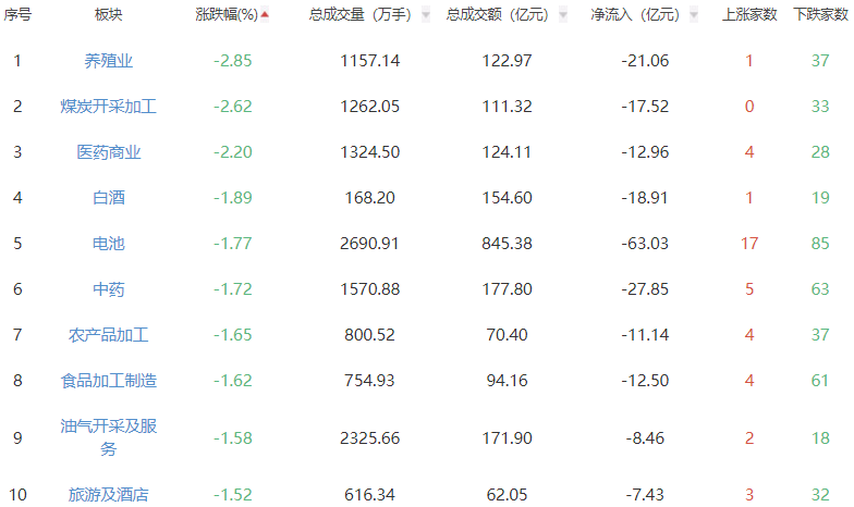 板块方面,贵金属、半导体、光伏设备等板块涨幅居前,养殖业、煤炭开采加工、医药商业等板块跌幅居前。