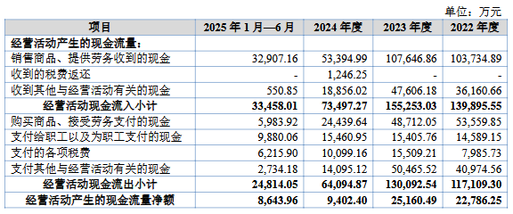 上述同期,公司经营活动产生的现金流量净额分别为2.28亿元、2.52亿元、9,402.40万元,销售商品、提供劳务收到的现金分别为10.37亿元、10.76亿元、5.34亿元。