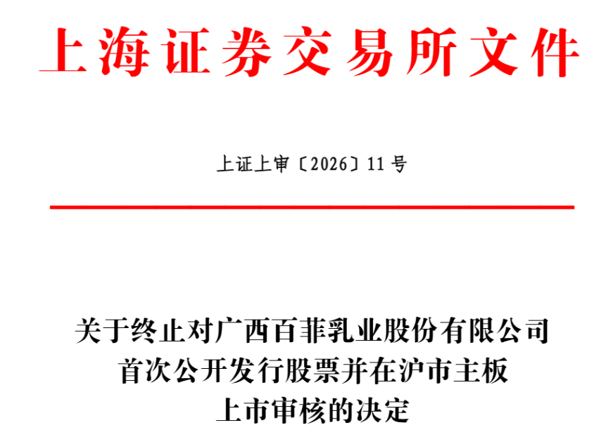 中国经济网北京1月30日讯 据上交所官网消息,上交所决定终止广西百菲乳业股份有限公司(以下简称“百菲乳业”)首次公开发行股票并在沪市主板上市审核。