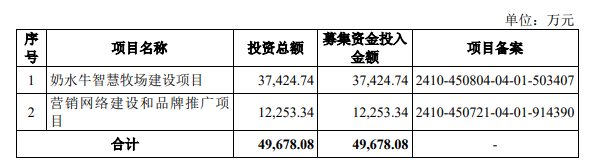 百菲乳业本次公开发行不超过5,516.7467万股,不低于发行后公司股本总额的25.00%,本次发行不涉及公司股东公开发售股份。百菲乳业原拟募集资金49,678.08万元,分别用于奶水牛智慧牧场建设项目、营销网络建设和品牌推广项目。