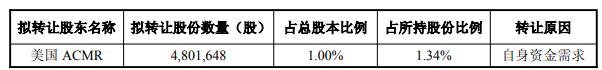 出让方拟转让股份的总数为4,801,648股,占盛美上海总股本的比例为1.00%;转让原因为自身资金需求。以盛美上海1月30日收盘价188.80元计算,美国ACMR询价转让拟套现90655.11万元。