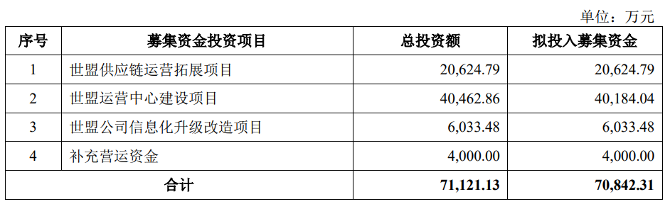 世盟股份本次发行募集资金总额为人民币64,603.00万元,扣除发行费用(不含增值税)后实际募集资金净额为55,804.31万元,比原计划少15,038.00万元。公司2026年1月29日披露的招股书显示,公司拟募集资金70,842.31万元,用于世盟供应链运营拓展项目、世盟运营中心建设项目、世盟公司信息化升级改造项目、补充营运资金。