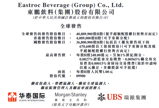 东鹏饮料的联席保荐人、整体协调人、联席全球协调人、联席账簿管理人及联席牵头经办人为华泰金融控股(香港)有限公司、摩根士丹利亚洲有限公司、UBS Securities Hong Kong Limited。