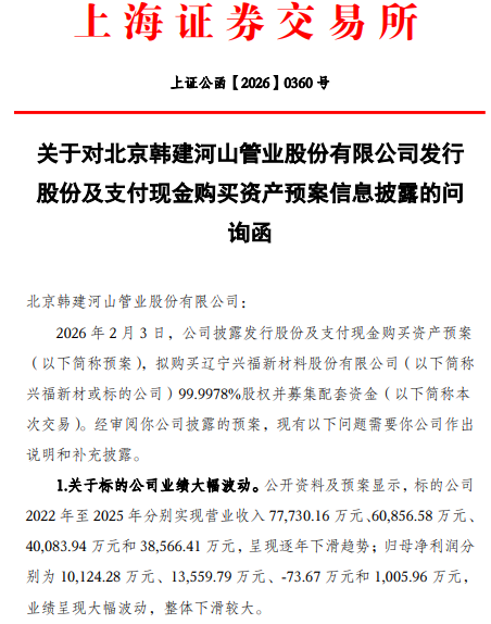 据上交所昨晚下发的关于对北京韩建河山管业股份有限公司发行股份及支付现金购买资产预案信息披露的问询函,经审阅韩建河山披露的预案,上交所指出3大问题需要公司作出说明和补充披露。
