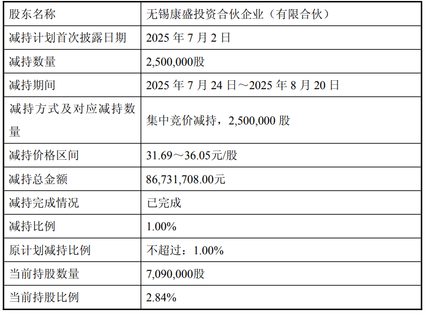 无锡振华2025年8月21日披露的公告显示,公司股东无锡康盛通过集中竞价方式共减持公司股份2,500,000股,无锡康盛本次减持计划已实施完毕,减持金额8673.17万元。