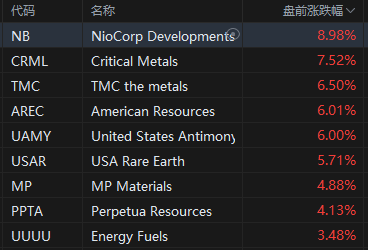 截至发稿,NioCorp Developments盘前涨近9%,Critical Metals涨超7%,TMC the metals、American Resources、United States Antimony涨逾6%,USA Rare Earth涨近6%、MP Materials涨近5%。