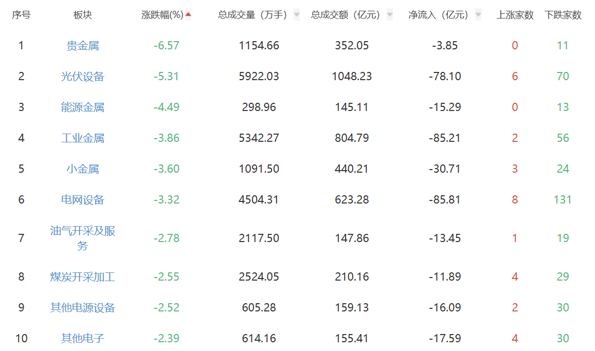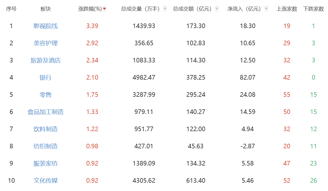 行业板块方面,影视院线、美容护理、旅游及酒店等板块涨幅居前,贵金属、光伏设备等板块跌幅居前。