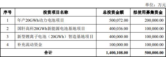 本次向特定对象发行股票的募集资金总额不超过500,000.00万元(含本数),在扣除发行费用后拟全部用于年产20GWh动力电池项目、国轩高科20GWh新能源电池基地项目、新型锂离子电池(20GWh)智造基地项目、补充流动资金。
