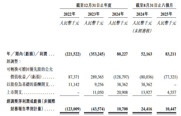 2022年、2023年、2024年12月31日止年度以及截至2024年及2025年8月31日止八个月,公司的收入分别约为人民币473.2百万元、人民币690.4百万元、人民币958.6百万元、人民币614.8百万元及人民币695.7百万元,净亏损/净利润分别约为人民币-221.5百万元、人民币-353.2百万元、人民币80.2百万元、人民币52.2百万元及人民币83.2百万元。