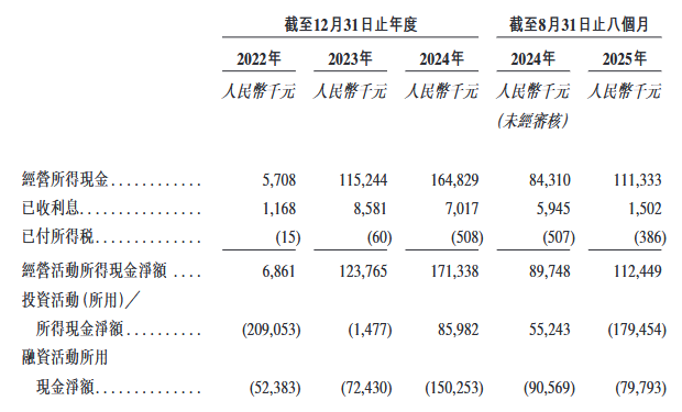 2022年、2023年、2024年12月31日止年度以及截至2024年及2025年8月31日止八个月,公司经营活动所得现金净额分别为人民币6.9百万元、人民币123.8百万元、人民币171.3百万元、人民币89.7百万元及人民币112.4百万元。