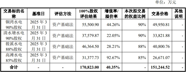 根据天健兴业评估出具的“天兴评报字(2025)第1181号”“天兴评报字(2025)第1182号”“天兴评报字(2025)第1183号”及“天兴评报字(2025)第1184号”资产评估报告,以2025年3月31日为基准日,评估机构对标的资产采取了资产基础法和收益法进行评估,最终采取资产基础法评估结果作为评估结论。标的资产铜湾水电90%股权、清水塘水电90%股权、筱溪水电88%股权及高滩水电85%股权采用资产基础法的最终评估值合计151,244.52万元,依据该评估结果为基础,交易双方确定本次交易的最终交易金额为151,244.52万元。