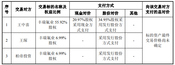 海南矿业昨晚披露的发行股份及支付现金购买资产并募集配套资金暨关联交易预案显示,上市公司拟通过发行股份及支付现金的方式向王中喜、王琛和柏帝投资共3名交易对方购买其合计持有的洛阳丰瑞氟业有限公司(以下简称“丰瑞氟业”)69.90%股权。本次交易完成后,丰瑞氟业将成为上市公司控股子公司。
