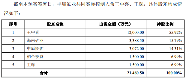 截至预案签署日,丰瑞氟业共同实际控制人为王中喜、王琛。