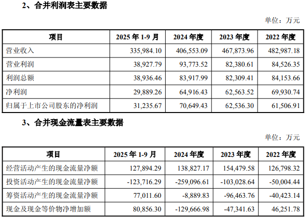 2023年度、2024年度、2025年1-9月,丰瑞氟业营业收入分别为60,898.53万元、66,813.52万元、49,482.79万元,净利润分别为11,438.14万元、13,611.43万元、13,038.22万元。