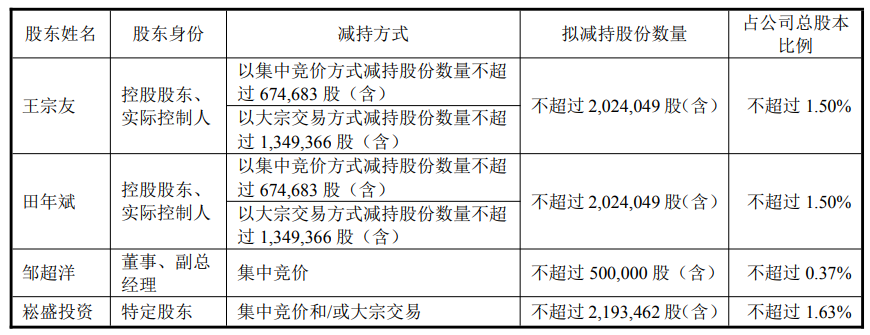 其中王宗友以集中竞价方式减持公司股份不超过674,683股(含),以大宗交易方式减持公司股份不超过1,349,366股(含),合计减持不超过2,024,049股(含,即不超过公司总股本的1.50%);田年斌以集中竞价方式减持公司股份不超过674,683股(含),以大宗交易方式减持公司股份不超过1,349,366股(含),合计减持不超过2,024,049股(含,即不超过公司总股本的1.50%)。