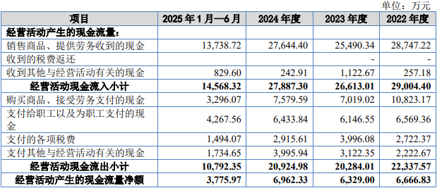报告期各期,公司销售商品、提供劳务收到的现金分别为28,747.22万元、25,490.34万元、27,644.40万元、13,738.72万元;经营活动产生的现金流量净额分别为6,666.83万元、6,329.00万元、6,962.33万元和3,775.97万元。