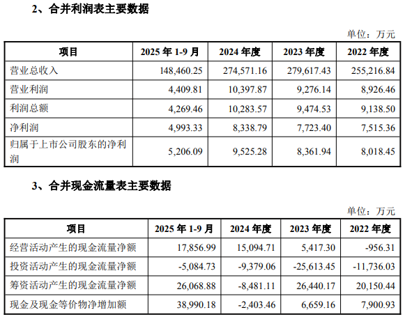 2024年度、2025年度,东实股份营业收入分别为387,530.63万元、473,333.53万元,净利润分别为36,935.33万元、35,492.59万元。