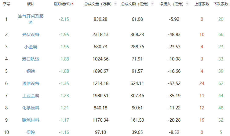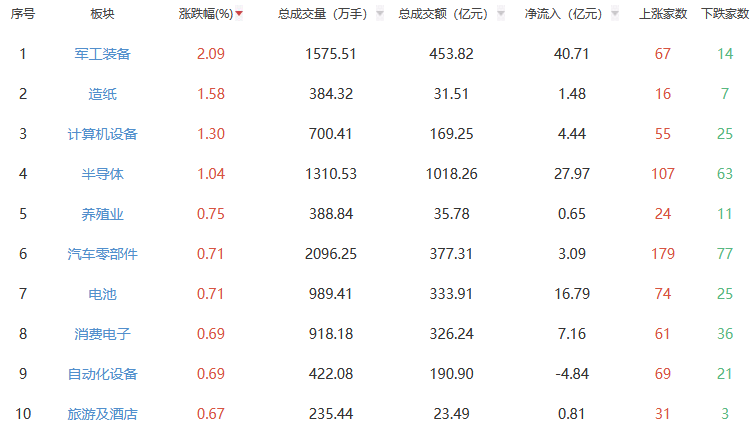 行业板块方面,军工装备、造纸、计算机设备等板块涨幅居前,油气开采及服务、光伏设备、小金属等板块跌幅居前。