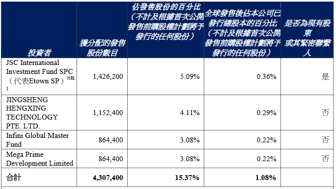 最终发售价及配发结果公告显示,海致科技集团全球发售项下的发售股份数目28,030,200股H股,其中香港发售股份数目2,803,200股H股,国际发售股份数目25,227,000股H股。