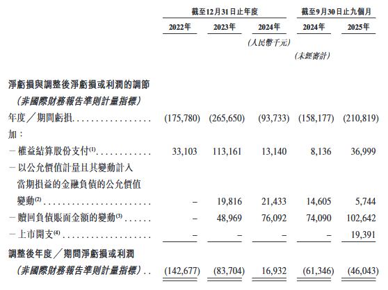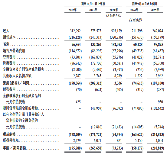 截至2022年、2023年、2024年12月31日止年度以及截至2024年及2025年9月30日止九个月,公司的收入分别为人民币313.0百万元、人民币375.6百万元、人民币503.1百万元、人民币211.8百万元及人民币249.1百万元,净利润分别为人民币-175.8百万元、人民币-265.7百万元、人民币-93.7百万元、人民币-158.2百万元及人民币-210.8百万元。