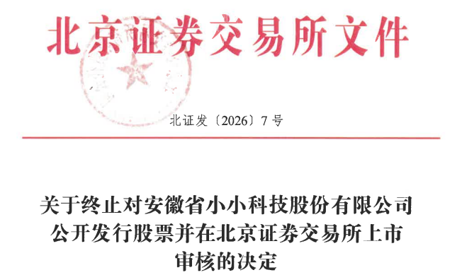 中国经济网北京2月13日讯 北交所网站今日公布关于终止对安徽省小小科技股份有限公司(以下简称“小小科技”)公开发行股票并在北京证券交易所上市审核的决定。