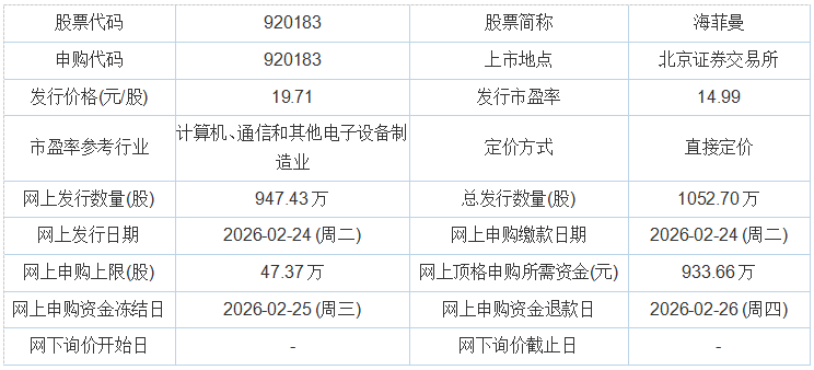 海菲曼2026年2月12日披露的向不特定合格投资者公开发行股票并在北京证券交易所上市发行公告显示,若本次发行成功,预计公司募集资金总额为20,748.76万元,扣除发行费用3,049.81万元(不含增值税)后,预计募集资金净额为17,698.95万元。