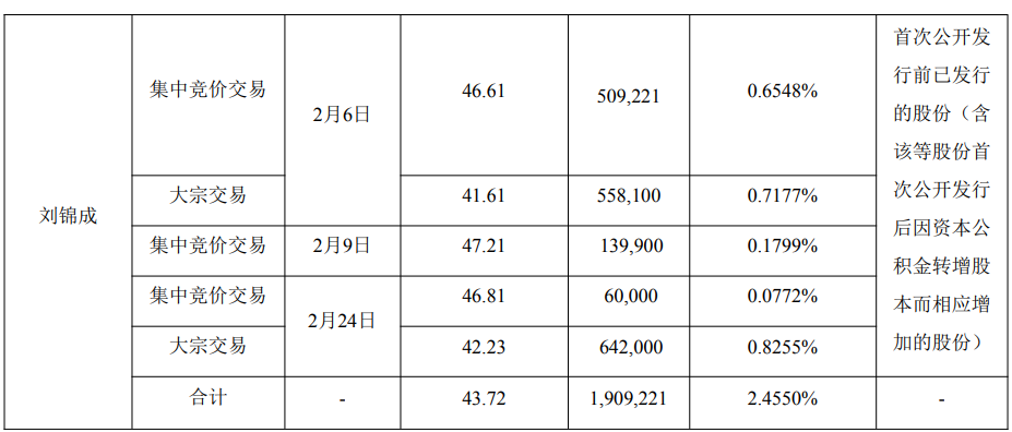 根据公告披露的减持均价40.45元/股计算,刘锦成本次减持套现约8244.71万元。