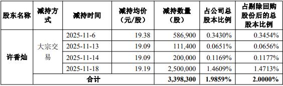公司2025年11月19日披露关于控股股东权益变动触及1%整数倍暨减持计划实施完毕的公告,公司于2025年8月7日披露公告,公司控股股东、实际控制人许香灿持有公司21,959,737股(占公司总股本的12.8326%,占公司当时剔除已回购股份后总股本数量的12.9237%)的股份,计划自公告披露之日起15个交易日后的3个月内通过大宗交易的方式减持公司股份合计不超过3,398,300股,即不超过剔除公司回购专用账户的股份数量后的总股本的2%。近日,公司收到许香灿和许文焕出具的告知函,自2025年11月6日起至2025年11月18日减持期间,许香灿通过大宗交易方式累计减持公司股份3,398,300股。许香灿和易仰卿共计套现约125755532.25元。