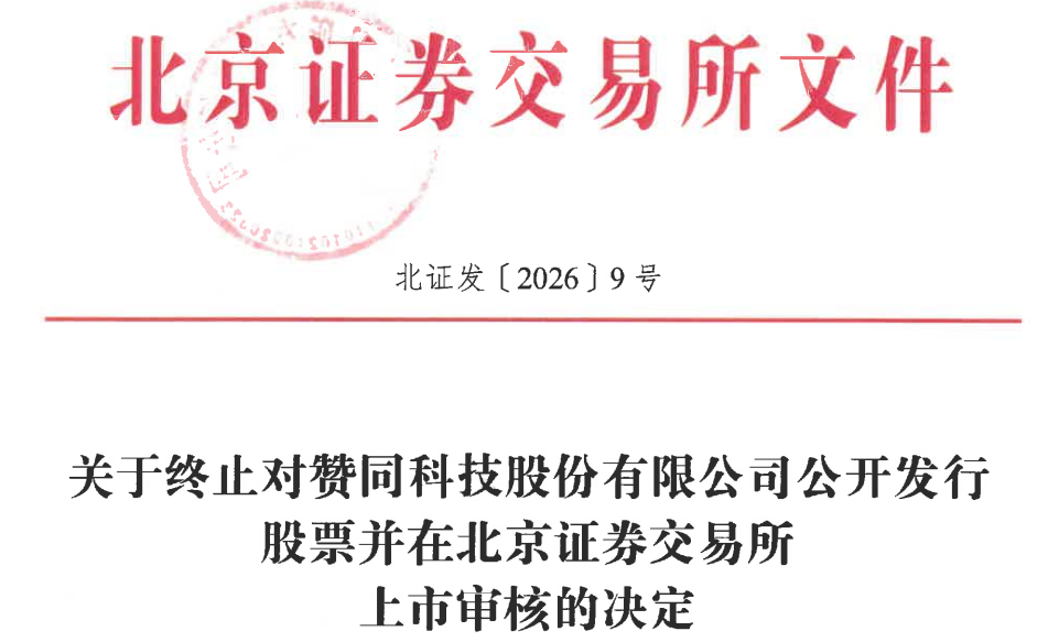 北交所于2025年6月30日受理了赞同科技提交的公开发行相关申请文件,并按照规定进行了审核。日前,赞同科技向北交所提交了《赞同科技股份有限公司关于撤回向不特定合格投资者公开发行股票并在北京证券交易所上市申请文件的申请》。根据《北京证券交易所向不特定合格投资者公开发行股票并上市审核规则》第五十五条的有关规定,北交所决定终止赞同科技公开发行股票并在北京证券交易所上市的审核。