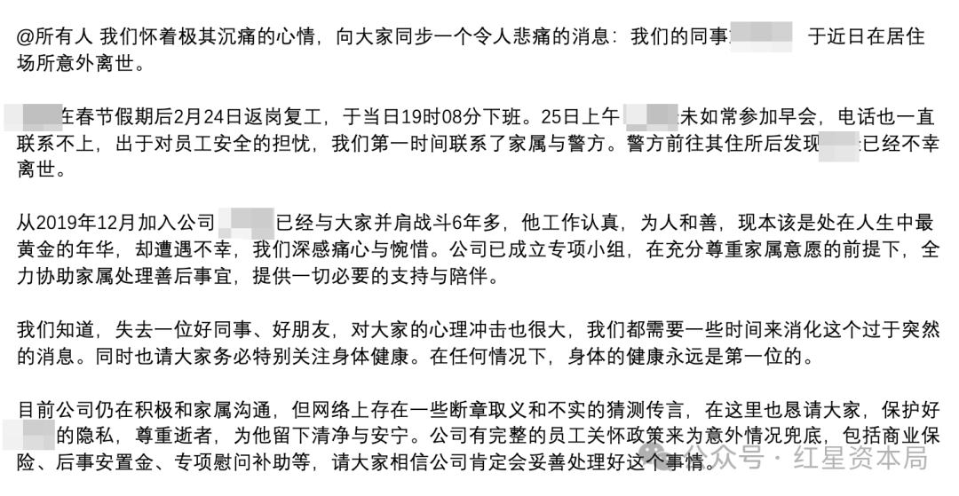 今日,米哈游还发布内部通报称,该名员工于2月24日返岗复工,当日19时08分下班,于次日上午被警方发现已在住所不幸离世。该员工于2019年12月加入米哈游,已入职6年多。公司已成立专项小组,在充分尊重家属意愿的前提下,全力协助家属处理善后事宜。