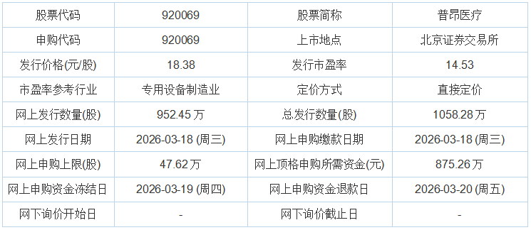 普昂医疗2026年3月16日披露的向不特定合格投资者公开发行股票并在北京证券交易所上市发行公告显示,若本次发行成功,预计公司募集资金总额19,451.19万元,扣除发行费用2,904.39万元(不含增值税)后,预计募集资金净额为16,546.80万元。