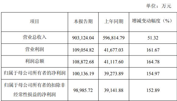 据公司2025 年年度业绩快报,报告期内,公司实现营业收入903,124.04万元,较上年同比增加51.32%;实现归属于母公司所有者的净利润100,136.19万元,归属于母公司所有者的扣除非经常性损益的净利润98,985.72万元。