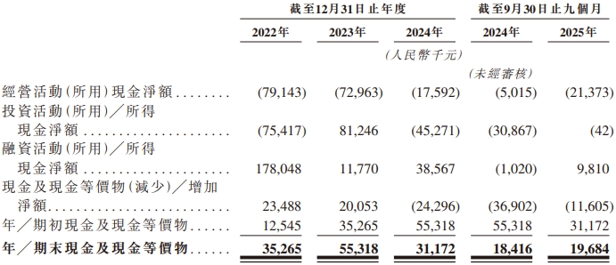 于2022年、2023年及2024年以及截至2024年及2025年9月30日止九个月,极视角经营活动所用现金净额分别为人民币79.1百万元、人民币73.0百万元、人民币17.6百万元、人民币5.0百万元及人民币21.4百万元。