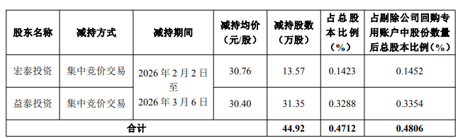 宏泰投资减持期间共减持13.57万股,套现417.41万元;益泰投资减持期间共减持31.35万股,套现953.04万元;宏泰投资、益泰投资共减持44.92万股,套现1370.45万元。