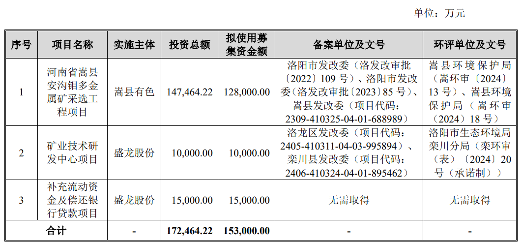 盛龙股份本次发行募集资金总额为168,130.00万元,扣除发行费用(不含增值税)后的实际募集资金净额为156,860.56万元,比原计划多3,860.56万元。盛龙股份2026年3月26日披露的招股书显示,公司拟募集资金153,000.00万元,用于河南省嵩县安沟钼多金属矿采选工程项目、矿业技术研发中心项目、补充流动资金及偿还银行贷款项目。